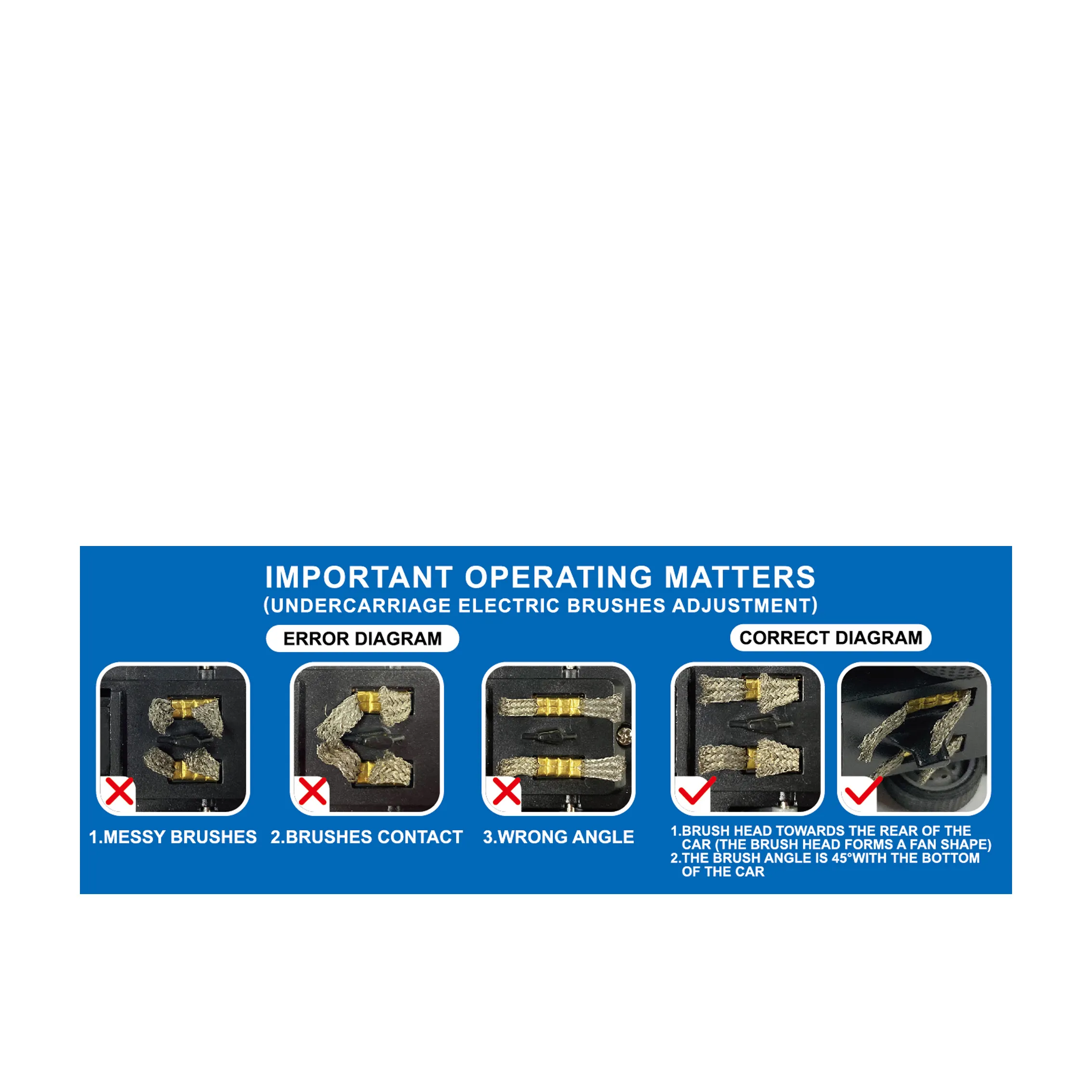 Use the wired controllers to control car speed. Push the lever up to accelerate and down to slow the car. Adjust the brush heads at a 45° angle for optimal performance.