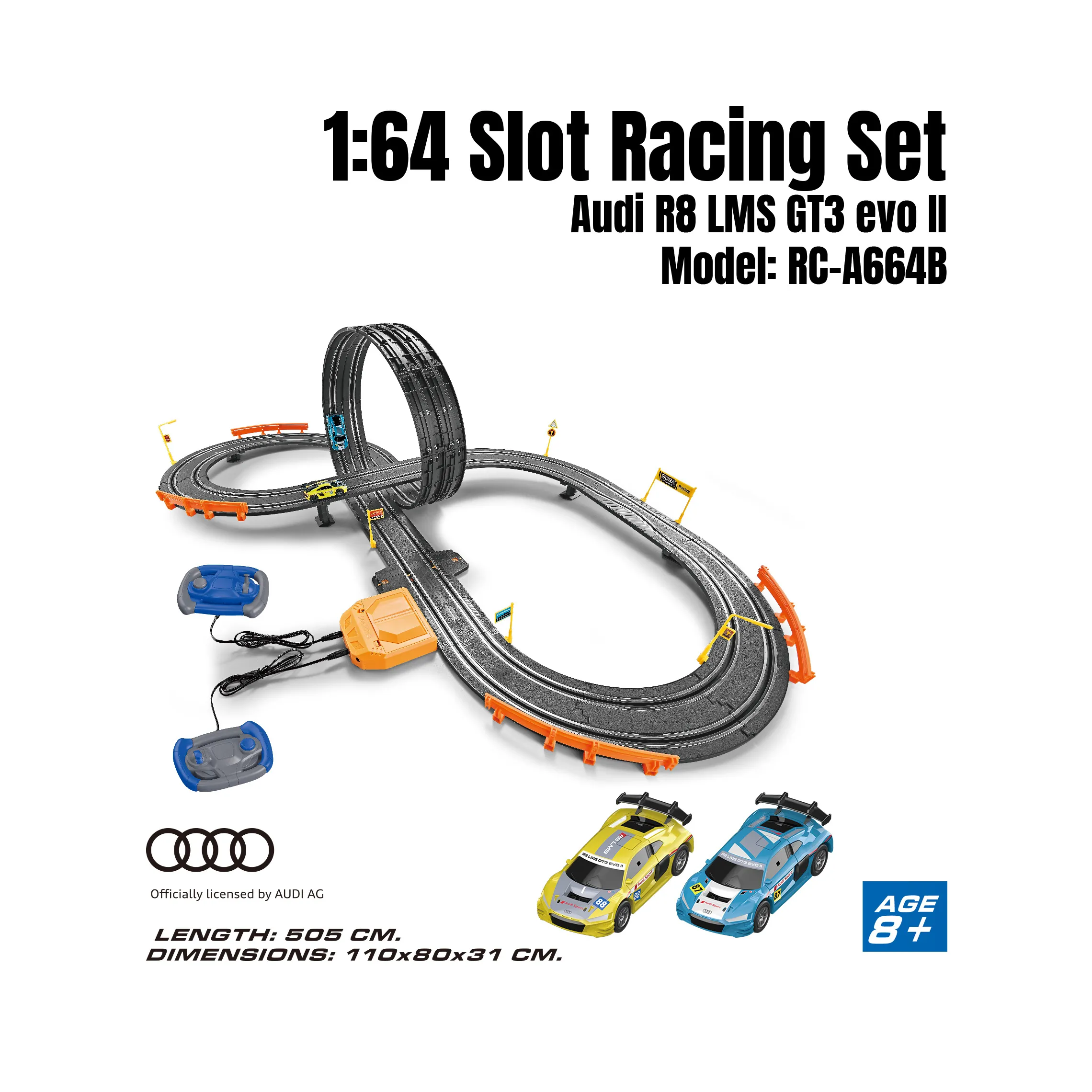 • 🎮 Dual Player Fun: Includes 2 Audi licensed race cars and 2 wired joystick controllers for competitive racing.