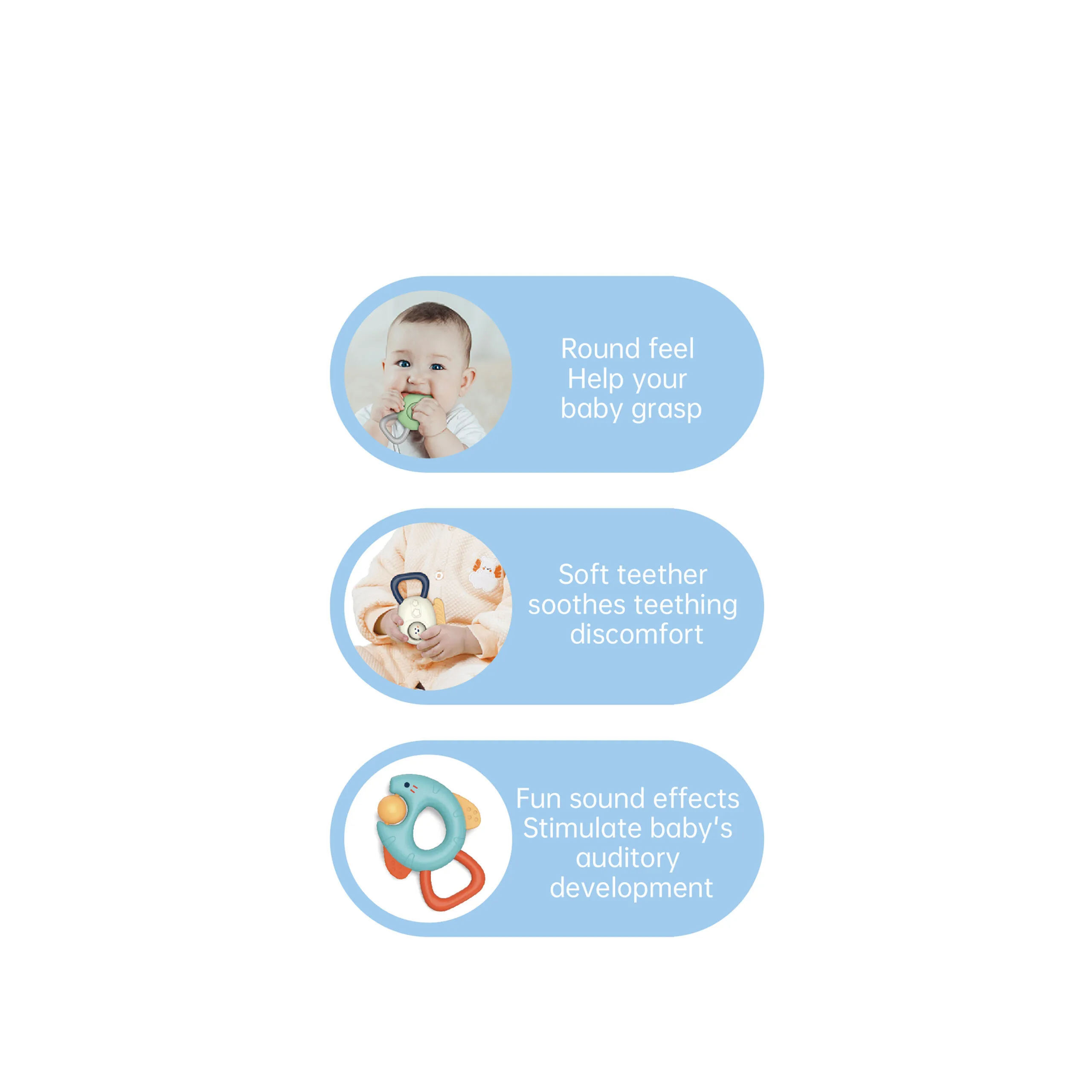 - Easy-to-grasp rattles that help babies develop motor skills quickly.