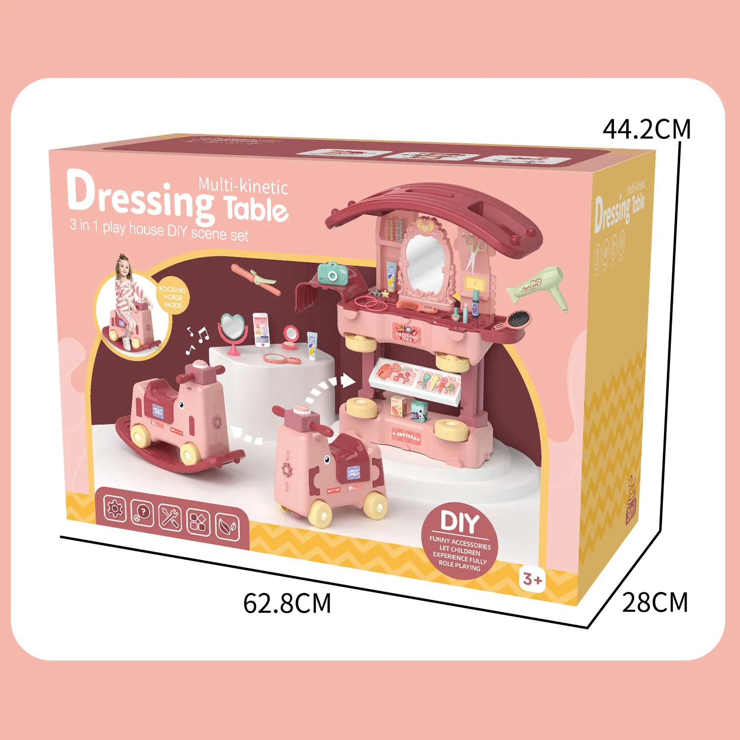 Looking for a kids vanity set that brings endless joy and creativity? Our Dressing Table-3 in 1 Play House DIY Scene Set combines a rocking horse, scooter, and vanity table into one exciting toy, designed to stimulate your child’s imagination and pretend play skills!