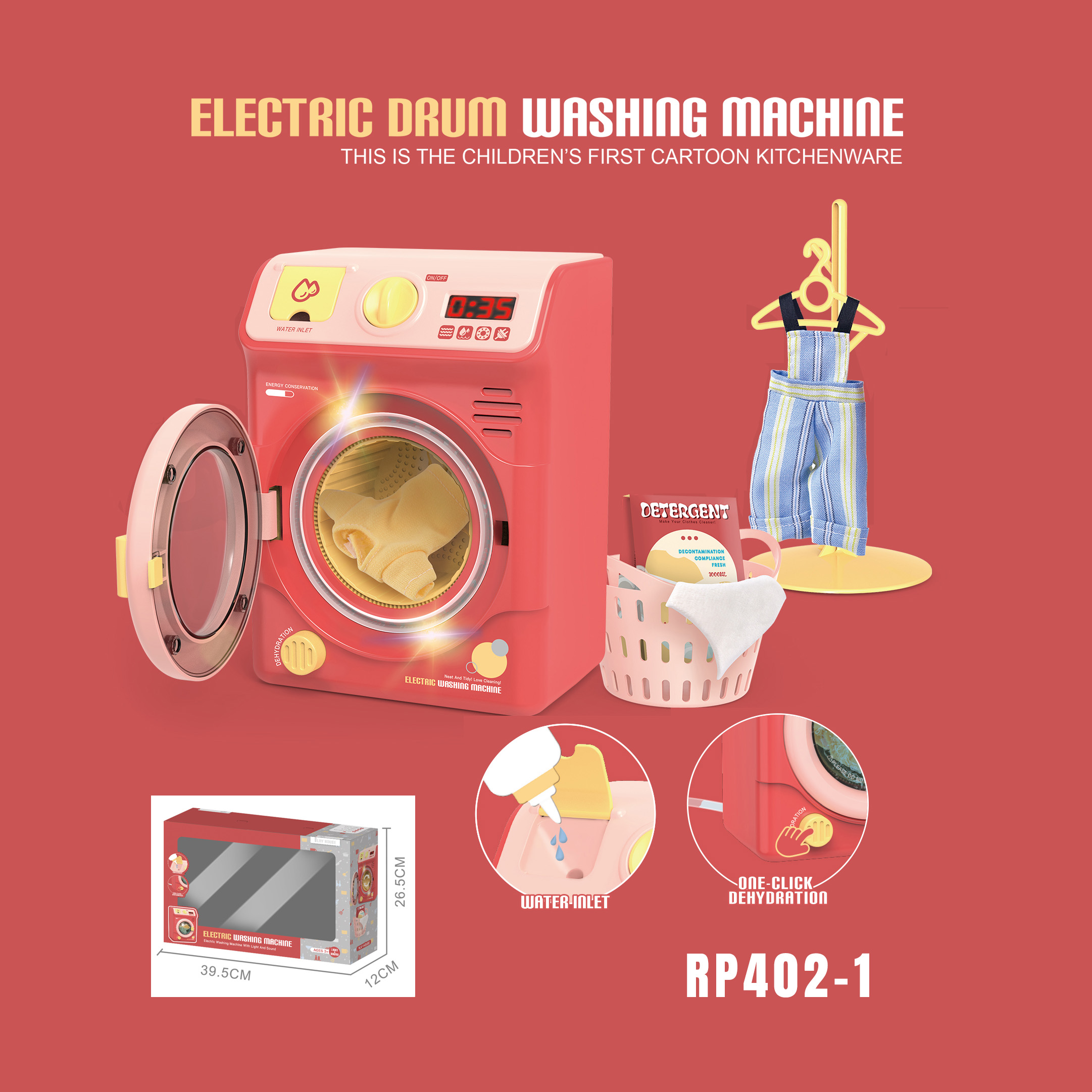 Make playtime exciting and educational with the Electric Drum Washing Machine (Model RP401-1). This battery-operated toy features a realistic rotating drum, light and sound effects, water-inlet for filling, one-click dehydration for spin-drying, and drain functions. Perfect for toddlers and young kids to enjoy realistic, hands-on pretend play.