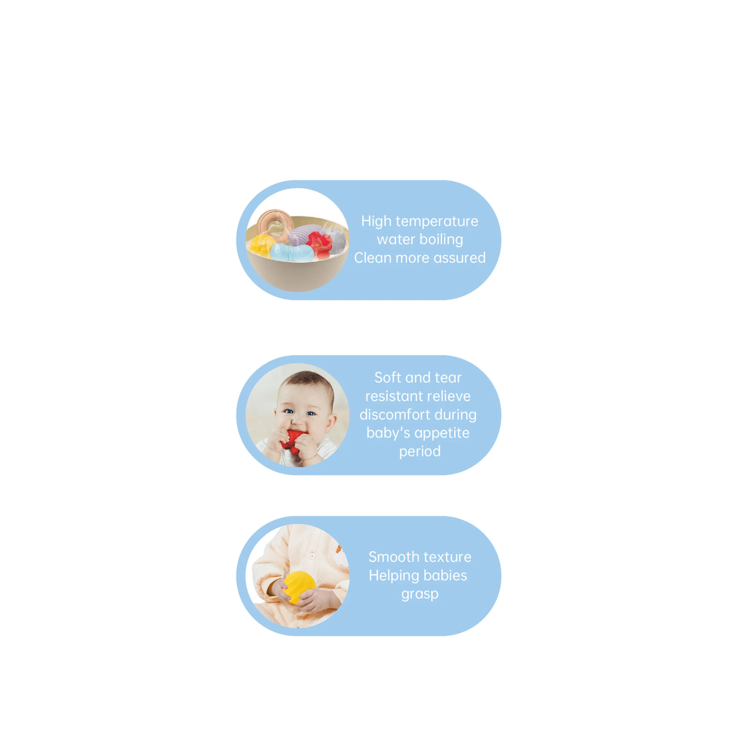 - Functions: Teething relief, sensory stimulation, auditory engagement, early hand-grip development