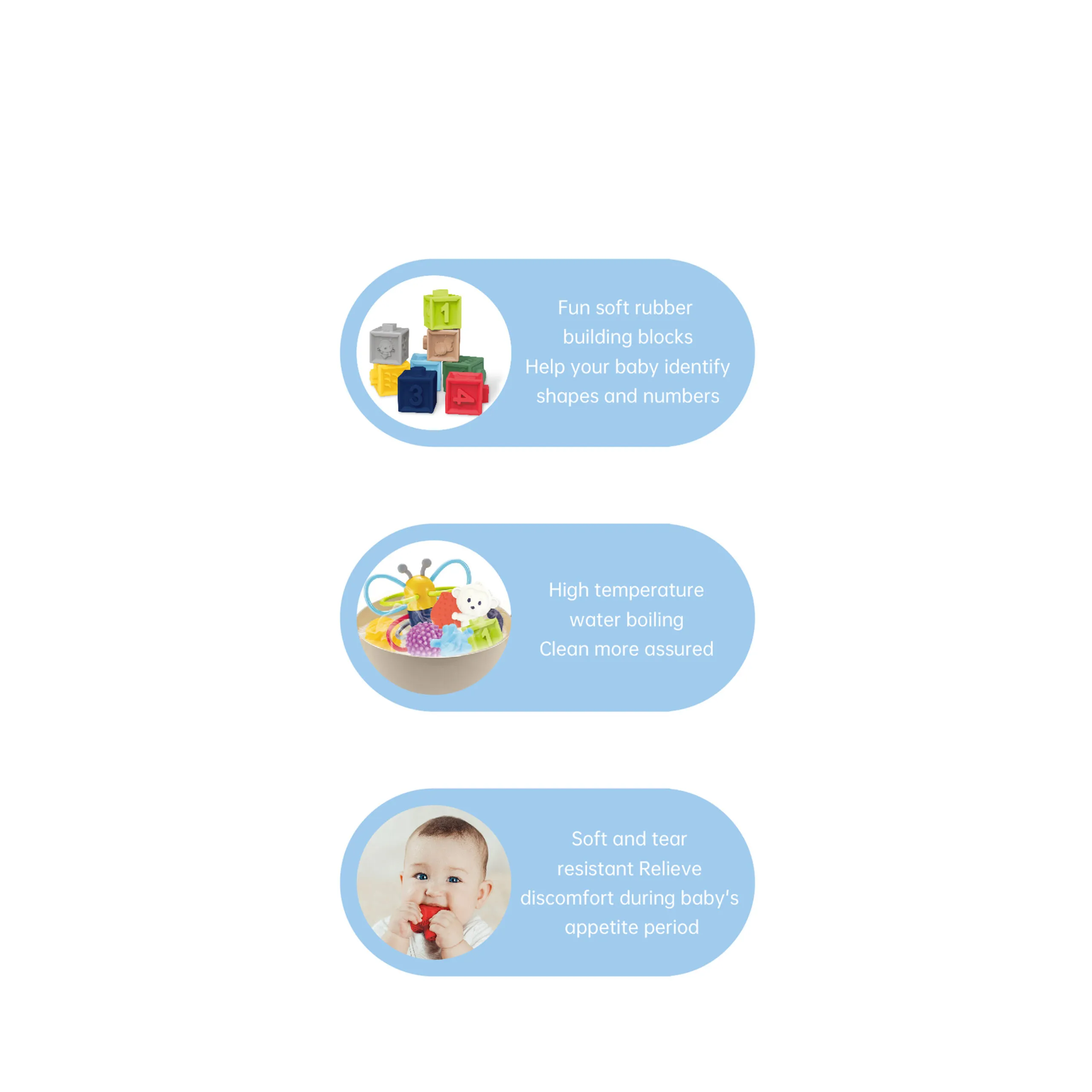 - ✔ Reduce teething discomfort with soft rubber materials