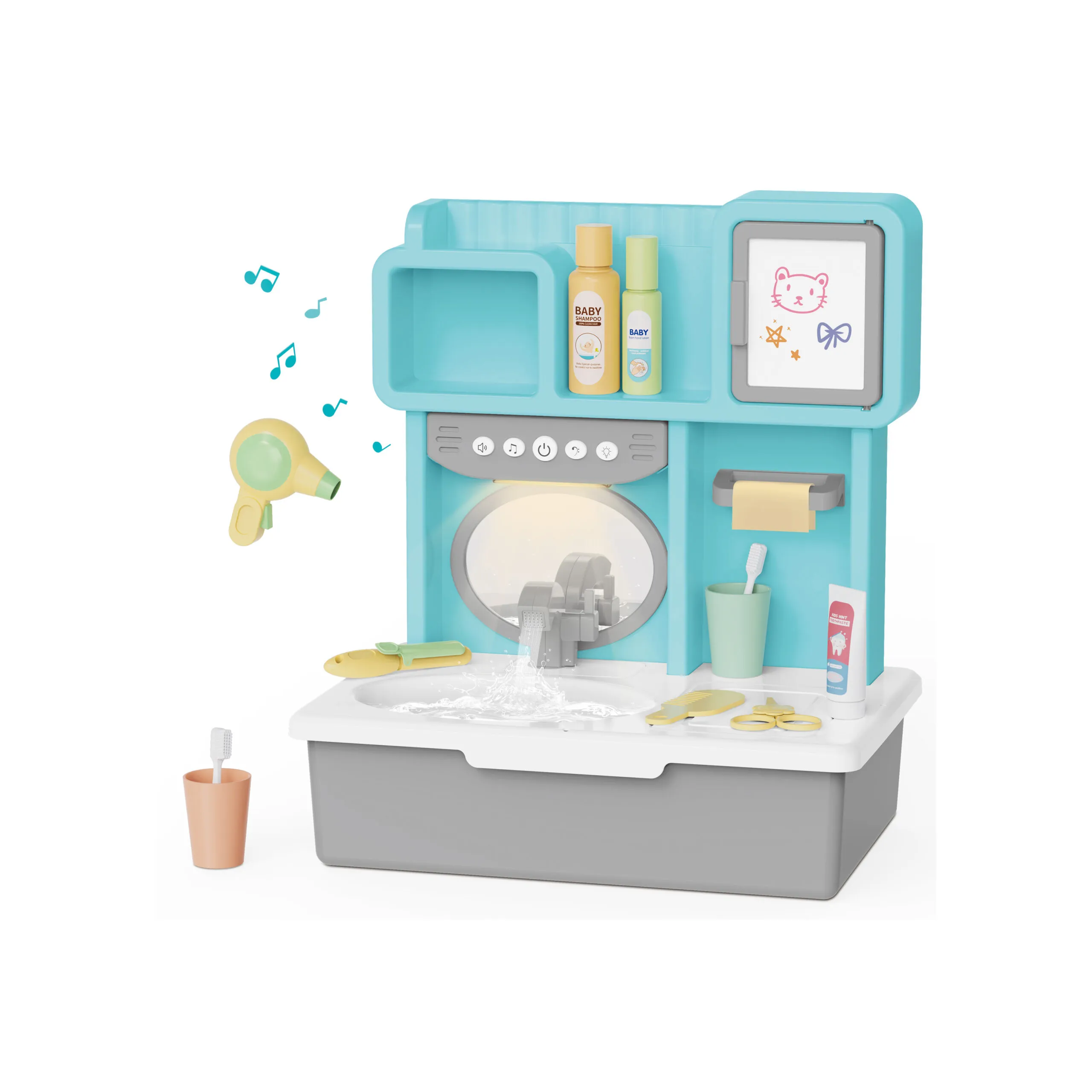 Children love to imitate adults. This bathroom role play toy includes a toy hair dryer, baby shampoo, baby foam, lotion, toothbrush, toothpaste, cup, mirror, comb, drawing board, paintbrush, and more. The realistic setup encourages hands-on interaction and strengthens fine motor skills.