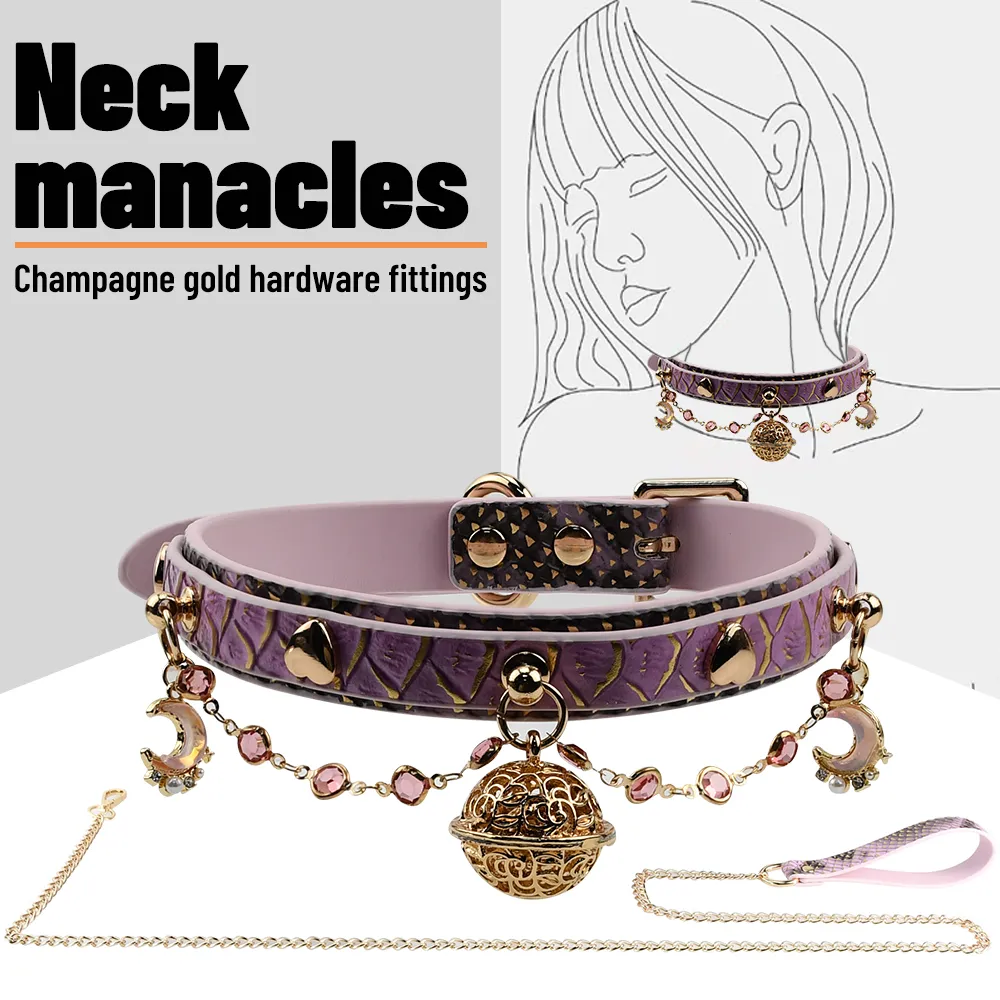 Includes neck manacles, handcuffs and foot cuffs with user-friendly button closures — practical for comfortable wear and quick release during play.