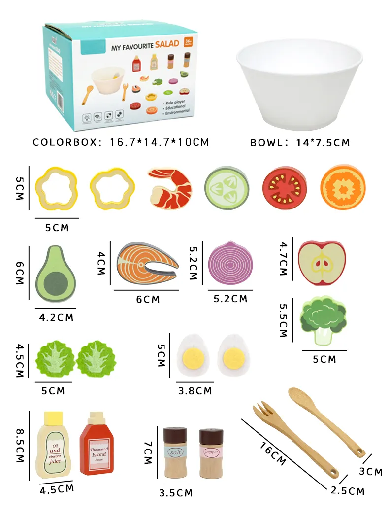 This wooden salad toy is made from high-quality MDF and hardwood, ensuring durability and long-lasting play. It is coated with eco-friendly water-based paint, making it safe for children while providing bright, vibrant colors.